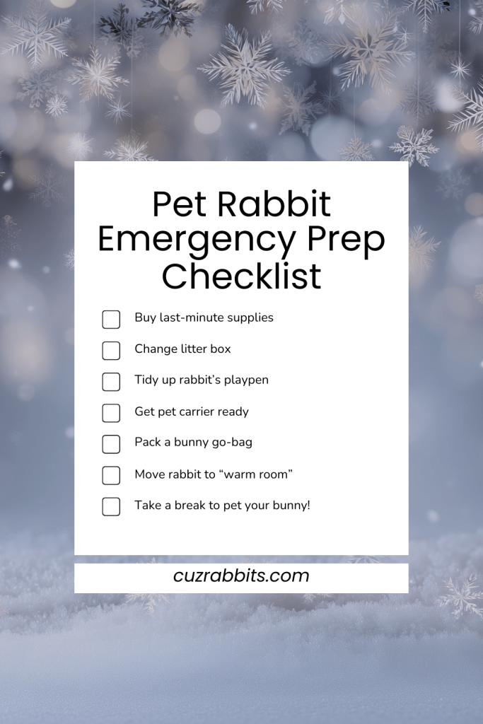 Rabbit pellets and treats aren’t necessarily needed in an emergency, but if you have time, you can stock up on those as well!