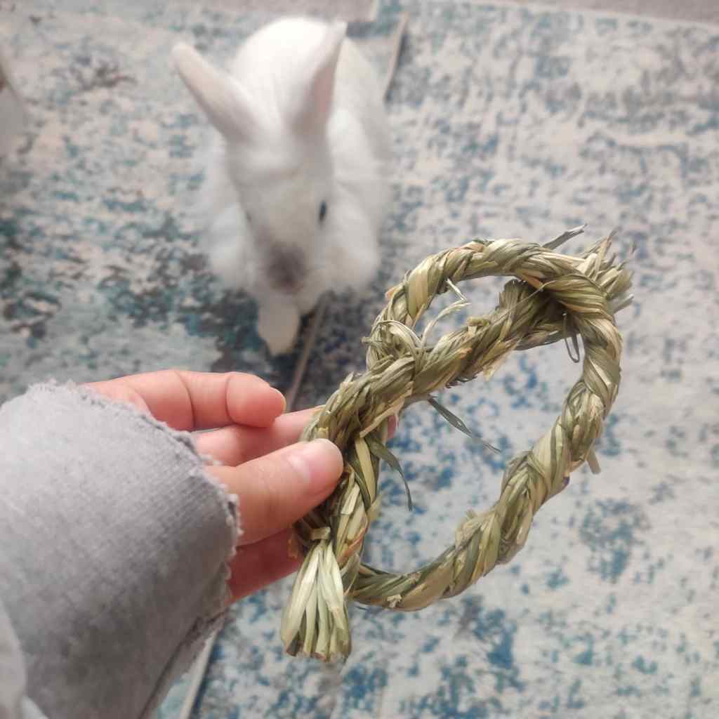 - Hanging cage hangings: Typically these are for birds, but if you can find one specifically geared towards bunnies, buy that instead. It’s more likely to be safe for rabbits (no glue). I like to hang these from the playpen, especially by the entrances. Instead of biting the gate, Baby “fights” with these hangings. There are also larger ones you can hang that offer extra enrichment for your bun’s mind.